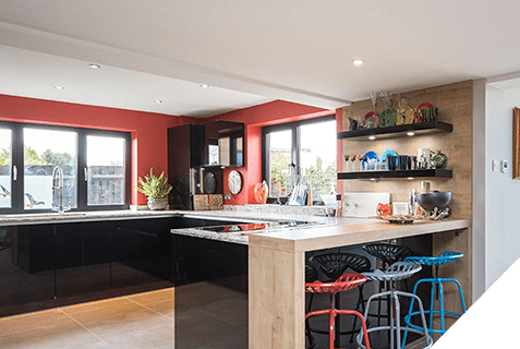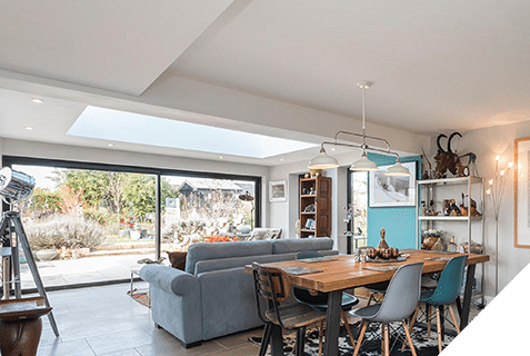 The eye-catching rustic extension allows a glorious three-zone kitchen, dining and living space where sliding doors and picture windows frame the magnificent views.