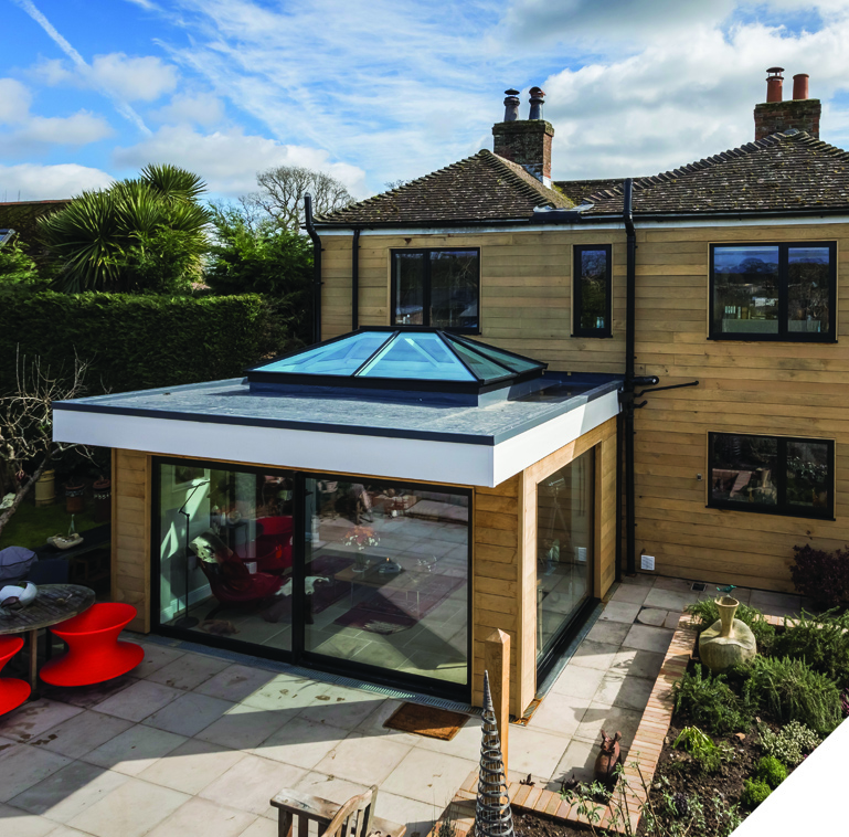 Striking black aluminium windows and oak cladding complete this original but very fitting look.