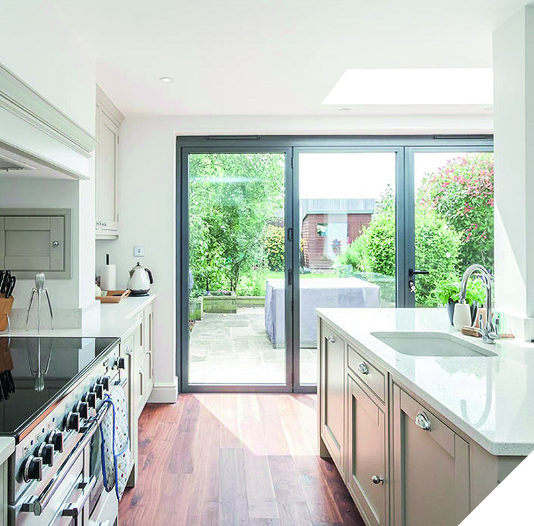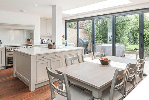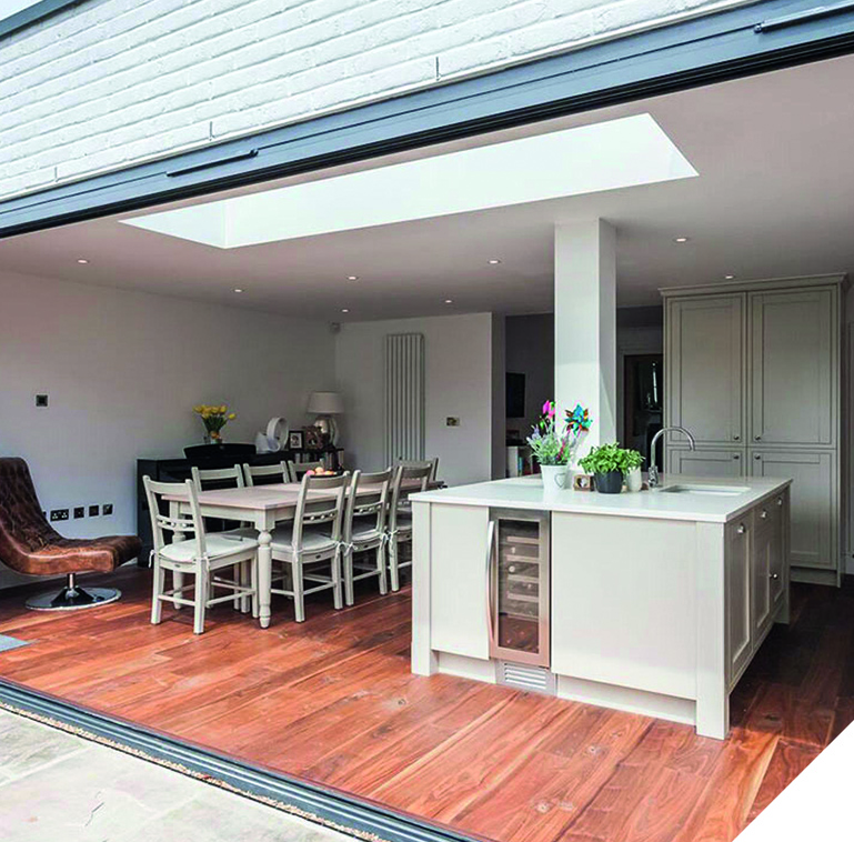 Extensive structural work opened up the space to allow a 6m aluminium bifold and a deep oak engineered floor to take centre stage in a kitchen with a more traditional feel.