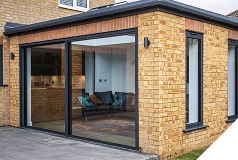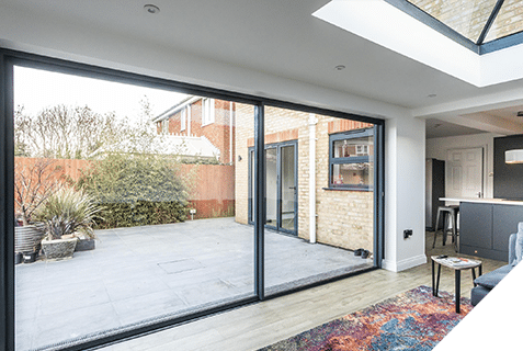 Taking the architectural designs as a starting point, not a definitive guide, we redesigned the glazing to include a huge 4.2m ultra thin frame sliding door over two door panels. We swapped existing UPVC doors to the dining room with an aluminium bifold; now a new patio connects these two doors, completing the space.