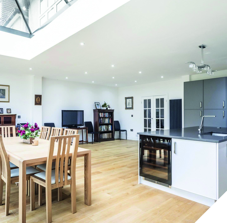 A large rear extension filled with light creating a very generous open-plan kitchen, dining and family space.